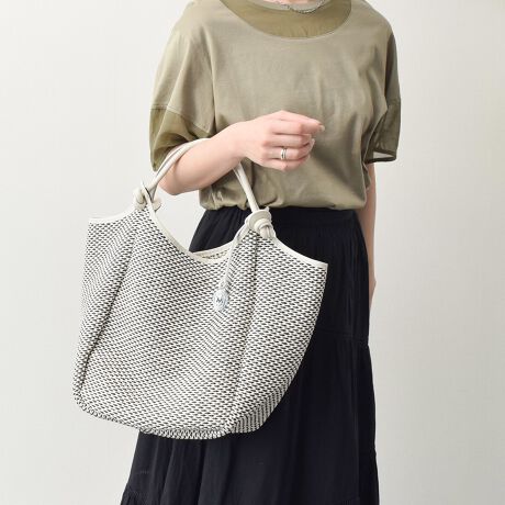 レザーハンドルの雑材バッグは、たっぷりと荷物を収納できるサイズ感で、デザイン性と機能性を併せ持ったアイテムです。