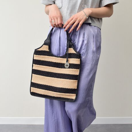 レザーハンドルの雑材バッグは、たっぷりと荷物を収納できるサイズ感で、デザイン性と機能性を併せ持ったアイテムです。