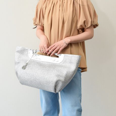 涼し気な素材感の異素材コンビハンドバッグは、たっぷりと荷物を収納できるサイズ感で、デザイン性と機能性を併せ持ったアイテムです。