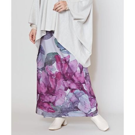 [型番:7CC-5107-2025]水彩画のように滲んだデザインが特徴のスカート。巻きスカート型なので、サイズレスに着られ、結ぶだけで着物のスカートのような印象に。シワになりにくい素材で、さらりとした着心地の一着になっています。