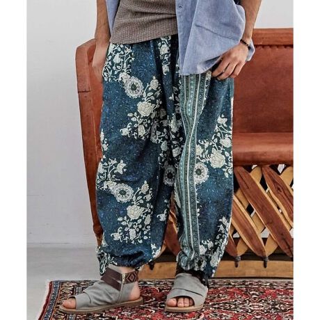 [型番:IAC-5150-2025]インドのペイズリーや花柄をプリントしたメンズパンツ。裾を絞ってシルエットを変えられる。サイドと右後ろには機能的なポケット付。