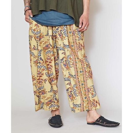 [型番:IAC-5150-2025]インドのペイズリーや花柄をプリントしたメンズパンツ。裾を絞ってシルエットを変えられる。サイドと右後ろには機能的なポケット付。