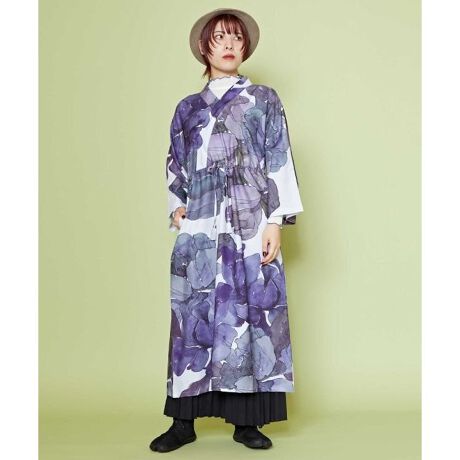 [型番:7CC-5106-2025]水彩画のように滲んだデザインが特徴の着物風ワンピース。シワになりにくい素材で、ゆったりとしたシルエットになっています。さらりとした着心地で、軽やかに着こなせる一枚。両サイドポケット付き。