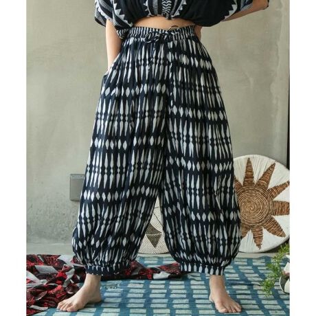 肌触りのいい綿素材を使用したバルーンパンツ。インディゴ染めや大地の色をモチーフとした色展開で、アフリカの力強さを表現。目が粗い綿素材で風通しが良く、ボリュームのあるシルエットがコーディネートを引き立たせるアイテム。ウエスト紐で調節可能。
