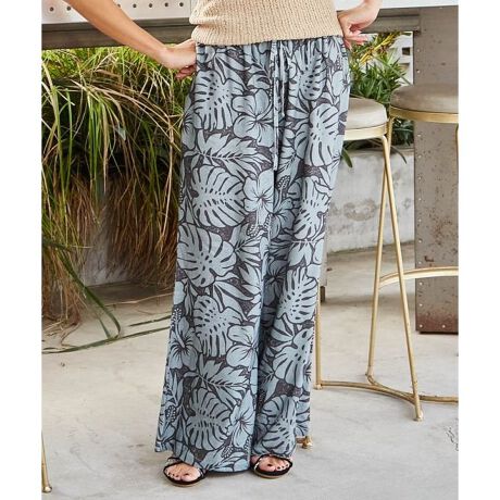 汗ばむ肌にもサラリと気持ちの良い麻レーヨン素材のフレアパンツ。ハワイを代表するボタニカル柄をヴィンテージ風にプリント。ウエストはゴムが入っており、紐で調節可能です。ポケット付き。