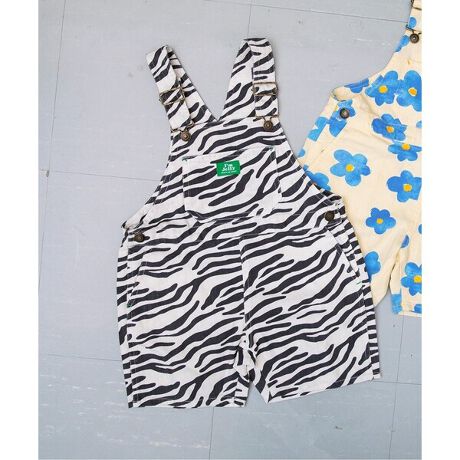 お花柄とゼブラ柄の総柄が目を惹くサロペットは
