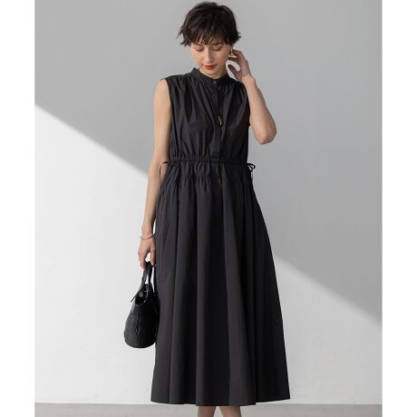 ウエストのシャーリングディテールが印象的なノースリーブワンピース。すっきりとした比翼仕立てのバンドカラーのノースリーブ。ウエストのシャーリングや切り替えテクニックをきかせることで、裾に向かってたっぷりボリュームを持たせたスカート部分が品よく広がるデザインです。ウエストサイドにあしらわれた細めの共布紐を結び、さりげなくフェミニンなアクセントを加えています。暑い時期に1枚でさらりと品よく決まるデザインながら、ジャケットやカーディガンとも相性よくあわせていただける1枚です。カラーは大人カジュアルを程よく引き締めるダークブラウン(#035)、ベーシックなブラック(#005)の2色展開です。