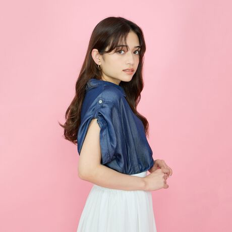 落ち感のあるデニム地のスキッパーカラーデザインのブラウスです。