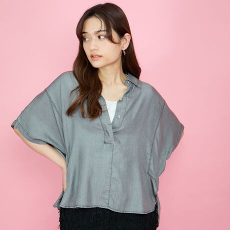 落ち感のあるデニム地のスキッパーカラーデザインのブラウスです。