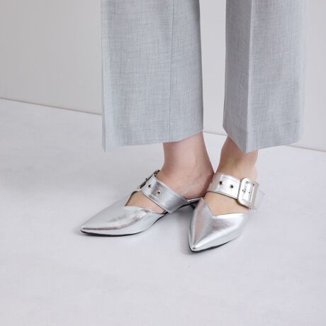 ハトメベルトのデザインがトレンド感たっぷりのポインテッドサンダル。