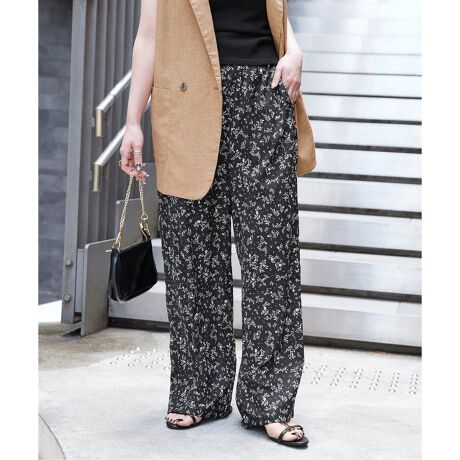 モノトーン配色と小さめの花柄が大人も着やすい、総柄パンツです。てろっとした素材感のイージーなシルエットで、ブラウスやカットソーなど柔らかい素材のトップスアイテムともカジュアル見えすぎずに合わせていただけます。