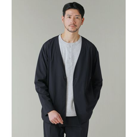 襟のないノーカラーデザインを採用し、カーディガンのような感覚で気軽に羽織れるジャケットに仕上げました。ゆとりのあるアームホール、ドロップショルダーが抜け感をプラス。両サイドに配したシームポケットはスッキリとした印象を崩さないまま機能性を高めています。ジャケットですが裏地を付けず、軽量で通気性が良いためロングシーズンご着用いただけます。