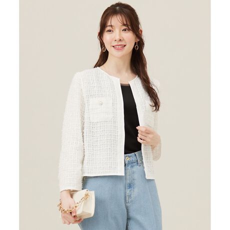 ・ジャケットのきちんと感もありつつカーディガンのような軽く楽な着心地・トレンド感のある立体的な素材で上品な華やか・パール調ボタン使いで上品な大人の可愛らしさをプラス・周囲をグログランでトリミングした繊細なディテールもポイント・前端裏側は細幅の見返し仕様を施し、前を開けたときの襟ぐりの崩れを軽減