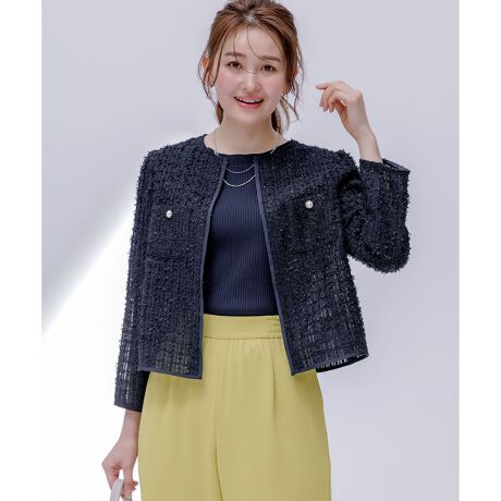 ・ジャケットのきちんと感もありつつカーディガンのような軽く楽な着心地・トレンド感のある立体的な素材で上品な華やか・パール調ボタン使いで上品な大人の可愛らしさをプラス・周囲をグログランでトリミングした繊細なディテールもポイント・前端裏側は細幅の見返し仕様を施し、前を開けたときの襟ぐりの崩れを軽減