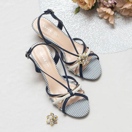 異素材を組み合わせた華奢なストラップに、ビジューパーツをプラスしたサンダル。