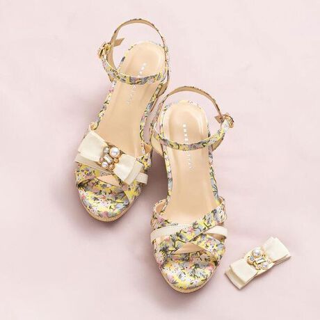 パールとラインストーン付きのプレートパーツを使用したリボンがアクセントのサンダル。