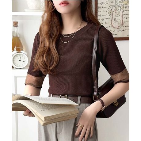 ベーシックカラーでシンプルな5分袖サマーリブニットで