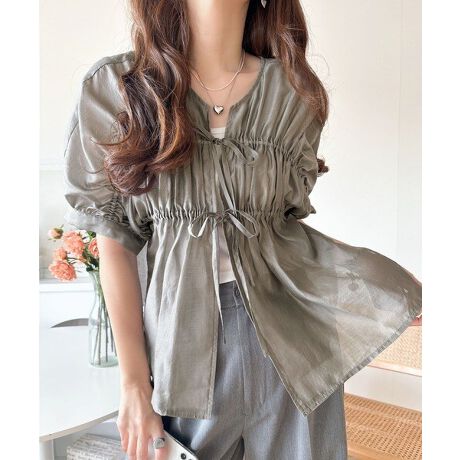 女性らしい甘さを引き立てるギャザーとリボンが魅力。
