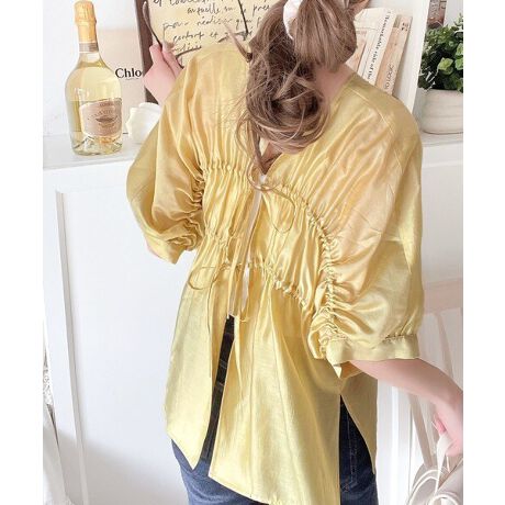 女性らしい甘さを引き立てるギャザーとリボンが魅力。