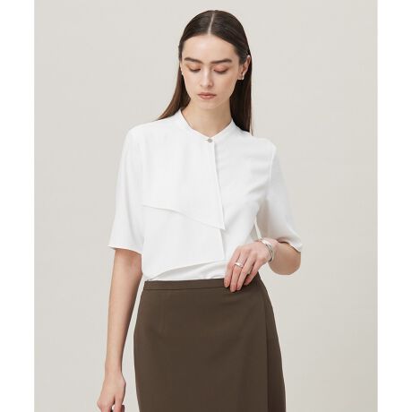 ■デザインアシンメトリーのラッフルディテールがポイントのブラウスです。メタル釦を効かせていて、一枚でもジャケットのインナーとしても、スタイリングに華やかさをプラスするアイテムです。