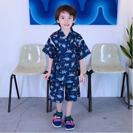 日本の夏の風物詩を恐竜さんで演出した総柄甚平です。