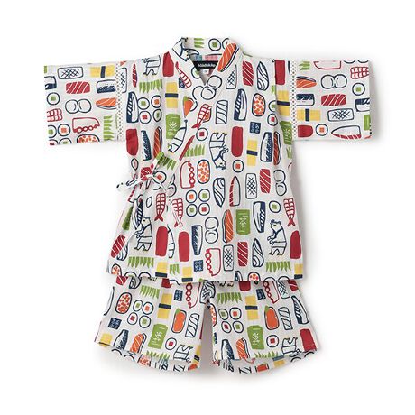 過去に人気のあったお寿司柄の甚平です。<br>クマさんがお寿司屋の大将になったユニークなデザインにアイキャッチ。<br>日本らしいイラストでインバウンドの方に贈るプレゼントにもおすすめです。<br>接触冷感機能が備わっており、汗ばむ季節も涼しく着用できます。<br>内側にはお名前を記入できるタグつき。<br><br>【透け感】透けない<br>【生地の厚さ】普通<br>【伸縮性】なし<br>【裏地】なし<br>【ポケット】なし<br>【アジャスター】なし
