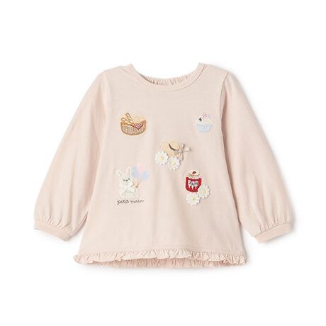 petit main公式キャラクターのププとテテと、ピクニックをイメージしたいくつかのモチーフが目を引くトップスです。