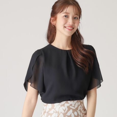 ジョーゼット素材で高級感が出るので、シンプルなボトムから柄など華やかなボトムまで幅広くコーディネートが可能です。スーツのインナーとしてもおすすめです。