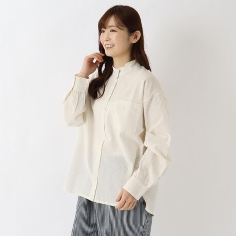 シャリ感のある綿麻生地のスタンドハイカラーのシャツブラウス。