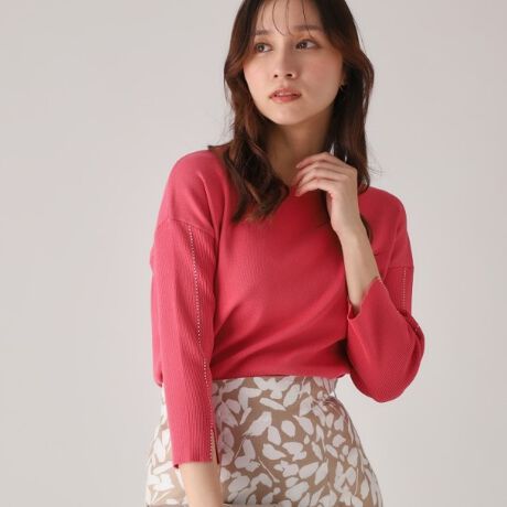 身頃は総針でしっかりとさせつつ、袖はリブ仕様で腕周りをすっきりと見せ、袖口のスリットが手首を美しく演出。