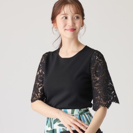 フェミニンで優美な印象のレースを袖にあしらったニットトップス。