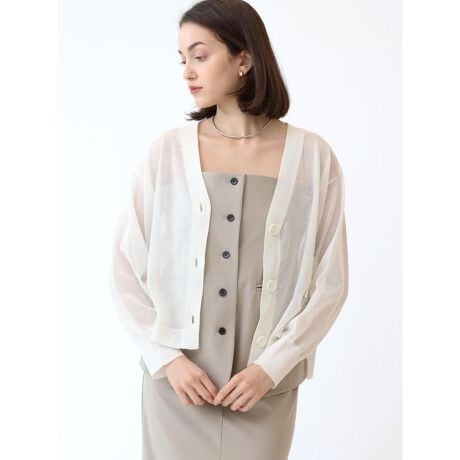 程よい透け感がシーズンムードを高めてくれるシアーカーディガン。身頃はゆったりとしたフォルムながらも、すっきりとしたネックラインが女性らしさをプラスします。夏には、紫外線対策や冷房対策としても活躍してくれます。絶妙な着丈がボトムスを選ばず、ストレスフリーな着心地で汎用性の高い一品です。
