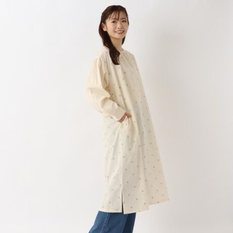 丁度良い丈の長さに小花柄刺繍をいれたワンピースです。肩の部分にシェル調のボタンをつけてちょっとアクセントにしています。