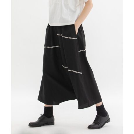 ゆったりとラフな履き心地で、こなれ感のあるおしゃれを叶えてくれるサルエルバルーンパンツ。丸が並んだオリジナルのライン刺繍を乗せました。左右前後でアシメトリーに刺繍をいれることで、モード感をプラスしています。素材は張りと落ち感、微光沢があり、カジュアルだけでなくきれいめにも活躍するリネンレーヨン。ウエストゴム仕様で楽に履いて頂けます。両サイドにはスカラップステッチ入りのポケットつき。