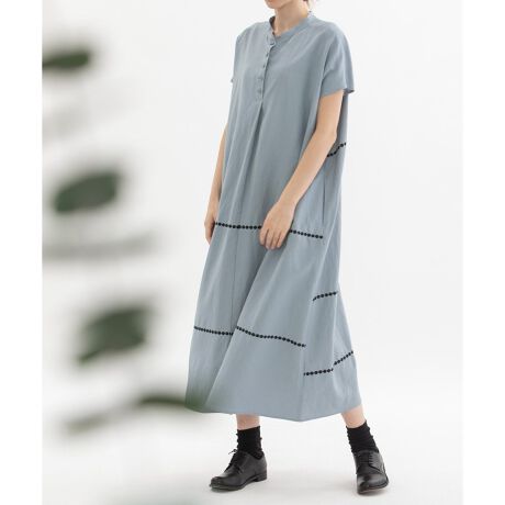 丸が並んだようなオリジナルのライン刺繍が入ったワンピース。前後でアシメトリーに刺繍をいれることで、モード感をプラスしています。上半身はすっきりとして、裾が広がったAラインシルエット。首からやや離れたボトルネックで前後どちらでも着用できる2way仕様です。素材は張りと落ち感、微光沢があり、カジュアルだけでなくきれいめにも活躍するリネンレーヨン。両サイドポケットつき。