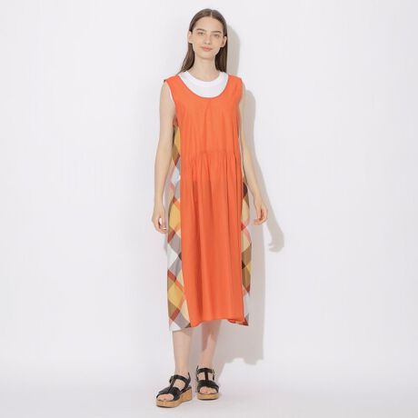 [型番:55J21569__]◆バックコンシャスジャンパースカート【Design】サイドのクレストブリッジチェック切替がポイントのジャンパースカートです。バックスタイルのギャザーデザインがアクセントになっています。身体のラインを拾わないシルエットと軽やかな素材が涼し気な一枚です。【Styling】グラフィックロゴノースリーブTシャツ(55P13547)をインナーに重ねたコーディネートがおすすめです。
