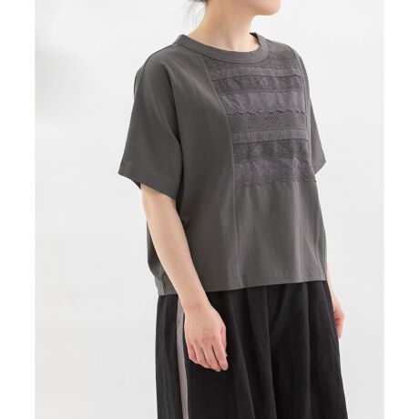 5種類のレースをたたいたTシャツ。やわらかな生地のドルマンシルエットです。アシメトリーデザインで甘すぎず、ゆったりワイドシルエットながらジャストな丈できれいめカジュアルに決まります。