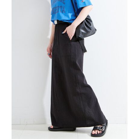 綿麻素材のドライな質感が大人っぽい印象のベイカースカートです。アウトドア系のクライミングパンツのディテールを落とし込み、すっきりとしたIラインシルエットですが、裾には後ろスリットがあるので足さばき良く履くことが可能です。