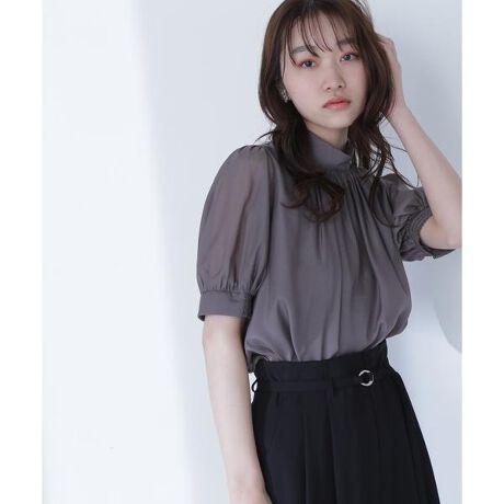 人気のシアー素材を使用した、夏にぴったりな半袖ハイネックブラウスです。袖はふんわりとしたパフスリーブで、シンプルなデザインに華やかさをプラス。袖口の内側はシャーリングゴム仕様のため、腕にフィットします。後ろネックはゴールドカラーの釦をつけて、バックスタイルも品よくまとめたデザイン。身頃は裏地がついているので透けを気にせず着ていただけます。<素材>程よいハリがあり、透けすぎないやや光沢のあるシアー素材を使用。<詳細>仕様・後ろボタン裏地・あり透け感・なし / 光沢・なし / 伸縮性・なし生地の厚さ・薄手※モデルの着用画像の場合、光の当たり具合により、実際の色味と異なって見えることがございます。色味は、商品単体の画像をご参照ください。