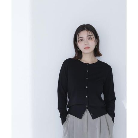 NBB定番人気!レーヨンナイロン素材のカーディガンが登場。今回はゴールドカラーの縁ボタンにアップデートしてワンテク効いた印象に。襟ぐりと前立てがしっかりとした編地で、さらっと羽織ったときにもキレイなネックラインをキープします。軽い素材なのでバックインで持ち運びもでき、これからの季節、冷房対策にもおすすめ。シンプルだからこそ仕立ての良さと素材にこだわったアイテムは、ONにもOFFスタイルにもシーンレスで活躍します。<素材>上品な印象のハイゲージの編地を使用。清涼感とシャリ感のある糸を使用し、暑い時期にも着やすい素材感です。<詳細>仕様・前ボタン裏地・なし透け感・ややあり / 光沢・なし / 伸縮性・あり生地の厚さ・普通※モデルの着用画像の場合、光の当たり具合により、実際の色味と異なって見えることがございます。色味は、商品単体の画像をご参照ください。