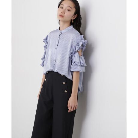 袖に抜け感のあるカッティングとラッフルをあしらった大人フェミニンなブラウスです。襟はバンドカラーデザインできちんと見えし、身頃は体のラインを拾いすぎないシルエット。ほんのりストライプ柄が効いた素材感と袖コンシャスなデザインが相まって、甘くなりすぎずに着ていただけます。<詳細>仕様・前ボタン裏地・なし透け感・ややあり / 光沢・ややあり / 伸縮性・なし 生地の厚さ・普通※モデルの着用画像の場合、光の当たり具合により、実際の色味と異なって見えることがございます。色味は、商品単体の画像をご参照ください。