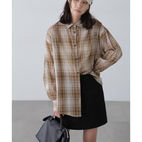レトロ古着のようなカラーのビッグチェック柄シャツ。ブラックベースのモノトーン柄と、ベージュベースのブラウン×イエローの配色で、どちらも合わせやすいカラーです。細番手の糸を使った繊細な織柄のオンブレチェックは、カジュアルながら大人も取りれやすい一枚。綿混の薄手素材なので長いシーズン着ていただけます。シンプルなボトムスを合わせてゆるっとカジュアルに着たり、ヒップが隠れるくらいのオーバーサイズなのでTシャツやシアーインナーに羽織るのも◎。ビスチェのように胸元に巻いたり、ラップスカートのように腰に巻くのも今年らしくておすすめです。※モデルの着用画像の場合、光の当たり具合により、実際の色味と異なって見えることがございます。色味は、商品単体の画像をご参照ください。