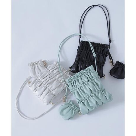 シャーリングを寄せた柔らかなボディのミニショルダーバッグです。同素材のミニポーチ付きで、イヤホンや細かいモノを収納したり、お持ちのバッグに付けるとチャームにもなります。口元はワンアクションで開くがま口仕様。ショルダー紐はスライドすると長さ調節ができ、肩掛けからクロスボディまで様々な持ち方を楽しめます。※モデルの着用画像の場合、光の当たり具合により、実際の色味と異なって見えることがございます。色味は、商品単体の画像をご参照ください。