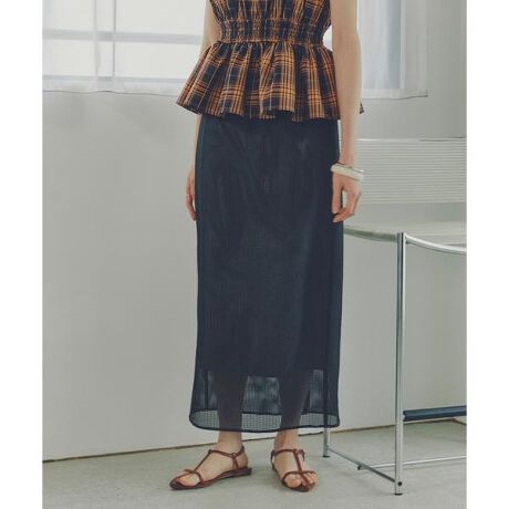 メッシュのような細かい格子柄の素材を使用したナロースカート。表地がシアー感のある素材のため、足元は涼しげで軽快さを印象づけてくれます。後ろはセンターベンツが入っているので足さばきも良い1枚。縦ラインを活かしたナローシルエットは、オーバーサイズのトップスと相性バツグン。裏地付きなのでシアー素材でも透けを気にしないで着ていただけます。<素材>オーガンジーのようなハリを持ちつつ、シアーな素材をベースに細かい格子柄が入った素材です。<詳細>仕様・後ろファスナー裏地・あり透け感・なし / 光沢・ややあり / 伸縮性・なし生地の厚さ・普通※モデルの着用画像の場合、光の当たり具合により、実際の色味と異なって見えることがございます。色味は、商品単体の画像をご参照ください。