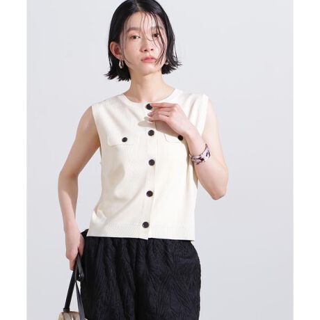 長すぎないコンパクトな着丈で、パンツにもスカートにも合わせやすいニットジレ。配色ボタンでモダンな印象と胸元のフラップでアクセントを加えたデザインです。ボタンを全て留めてトップス風に着こなせます。<素材>さらっとして少しひんやりと感じる糸を使用しています。<詳細>仕様・前ボタン裏地・なし透け感・ややあり / 光沢・なし / 伸縮性・あり生地の厚さ・普通※モデルの着用画像の場合、光の当たり具合により、実際の色味と異なって見えることがございます。色味は、商品単体の画像をご参照ください。