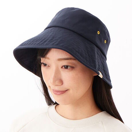 紫外線(UVA、UVB)を効果的に遮断する生地が使用されており、表地と裏地の両方にその生地が使われています。また、内側の周囲にはマジックテープが装備されており、これによってサイズ調整が可能!また、内側にはあご紐を装着できるループ部もありますので、お手持ちのあご紐をつければ、風で飛んでいく事も減ります。