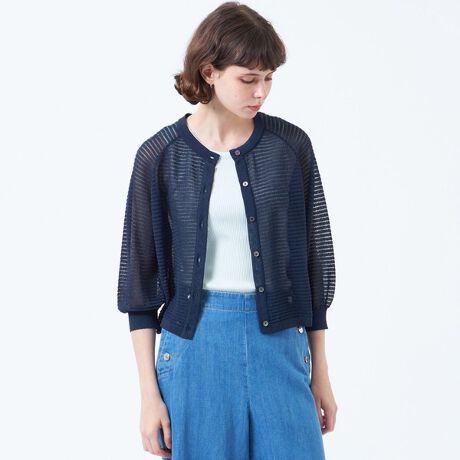 編み柄で表現した、表情のあるボーダー柄が程よくアクセントをプラス。ボリュームスリーブでゆとりのあるシルエットと軽い仕上がりが特徴です。