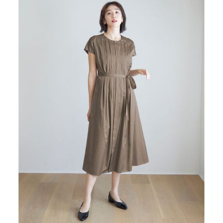 広がり過ぎない美シルエットの1枚映えワンピース■デザイン前後の身頃のタックディティールと、タックから生まれるドレープが華やかな印象のワンピースです。ウエスト部分までタックを縫い留めているため、程よくゆとりがありながらも広がり過ぎず、すっきりとした身頃からなだらかにスカート部分のフレアに繋がる美しいシルエットです。共のサッシュベルトでウエストマークした、より女性らしい着こなしもおすすめです。■素材経糸にリサイクルポリエステル、緯糸に綿を使用し、シルクのような風合いを出したサテン組織で上品で高見えする素材です。シルクのような適度な軋みと光沢、ドレープ性があり、リサイクルポリエステルを使用したエコ素材です。