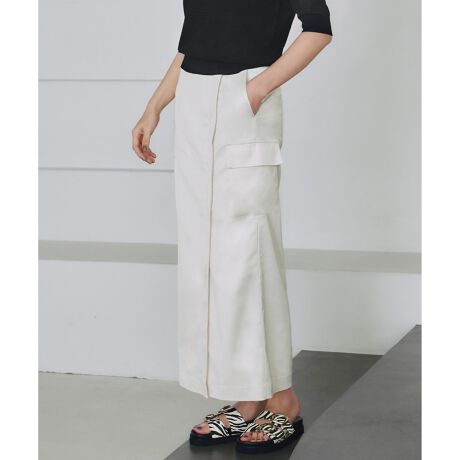 ■デザインカーゴディテールを効かせたラップ風デザインがポイントのIラインスカートです。腰回りはスッキリ仕上げていて、フロントのスリットで女性らしく着こなせるデザインに仕上げています。ウエスト部分はゴムを内蔵させたスマートバック仕様で、ラクな履き心地なのも嬉しいポイント。
