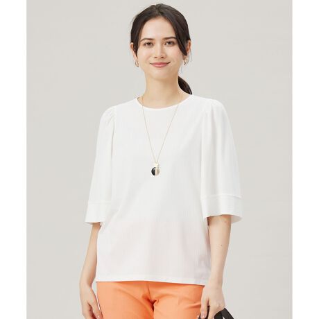爽やかなストライプ柄のフレアスリーブカットソー■デザインストライプ柄のフレアスリーブカットソーです。ふんわりとした袖デザインと5分袖が二の腕周りをカバーしてくれます。ストライプの柄を活かし、袖口はボーダーにすることでデザインポイントにしています。身頃はコンパクトなボックスシルエットなので、ボトムを選ばず着て頂けます。■素材セルロースと綿の混紡糸を使用し、毛羽を極限まで抑えてすっきりと仕上げています。汗をかいても肌離れしやすいよう、ブランドオリジナルでツイスト編みで仕上げています。接触冷感、UVカットの機能付きです。■同素材アイテムフォルムスリーブカットソー(KKW7GM0433)